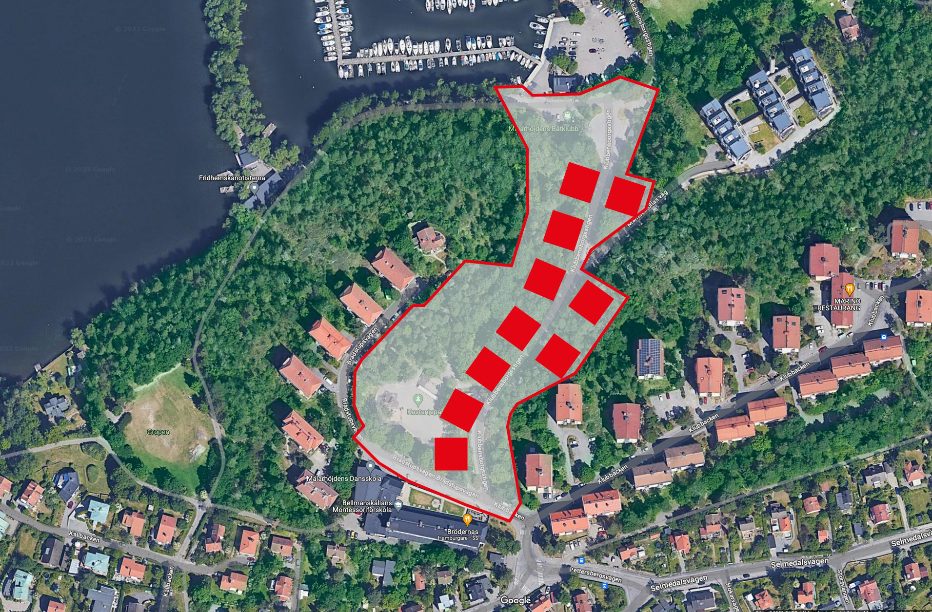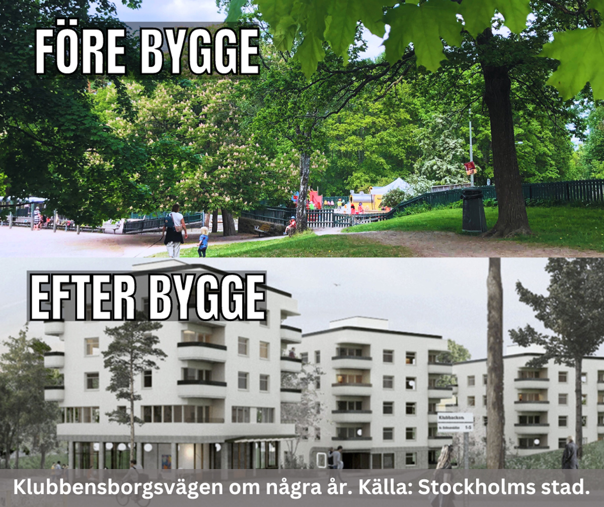 10 stora höghus placeras rakt igenom lekparken och i skogen nedanför. Bygget kommer gå längs Klubbensborgsvägen på båda sidor. I det nya förslaget går husen hela vägen ner till Klubbensborg. Se kommunens foto ovan.